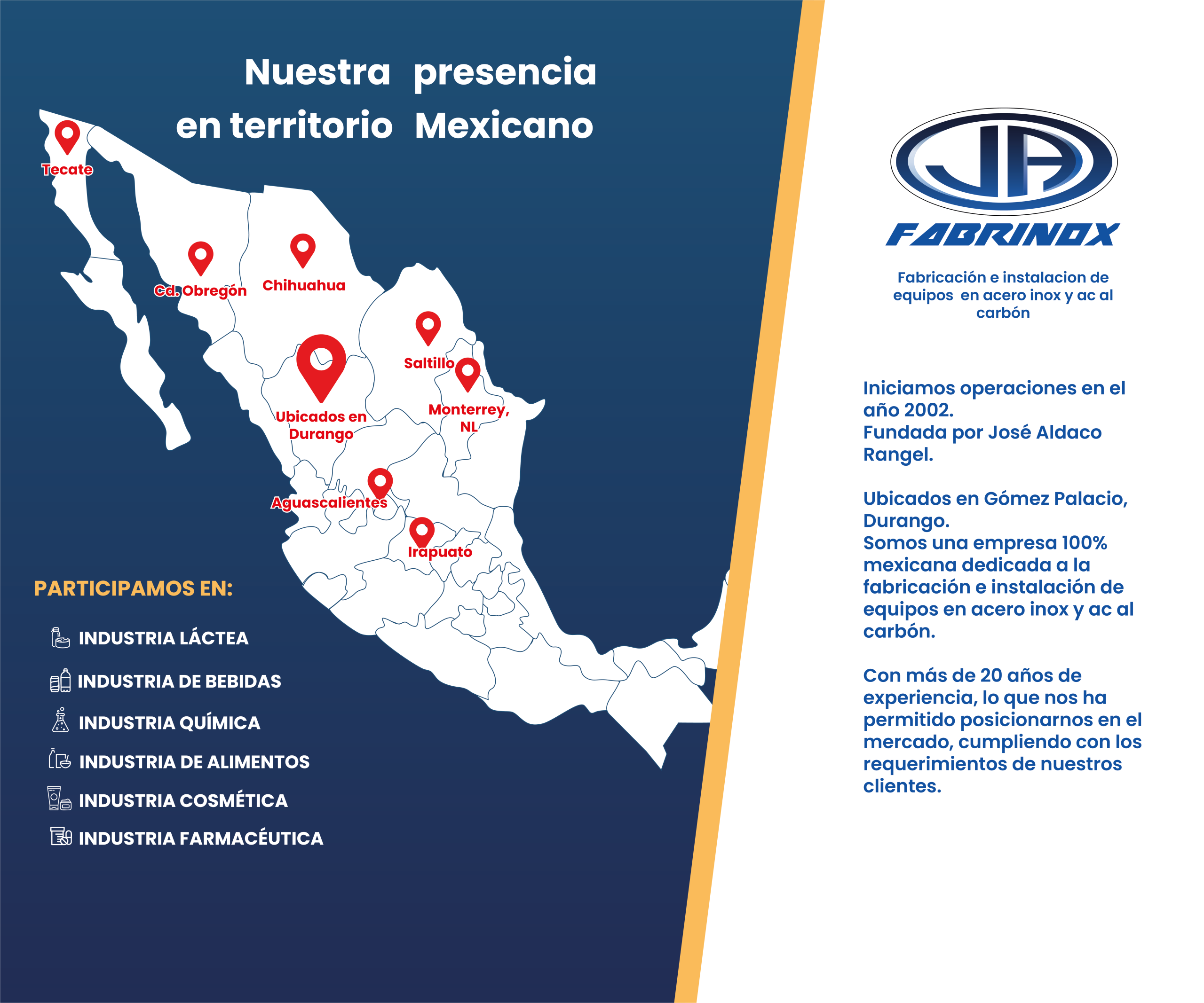 Somos una empresa 100% mexicana dedicada a la fabricación e instalación de equipos en acero inox y ac all carbón. Con más de 20 años de experiencia, lo que nos ha permitido posicionarnos en el mercado, cumpliendo con los requerimientos de nuestros clientes.